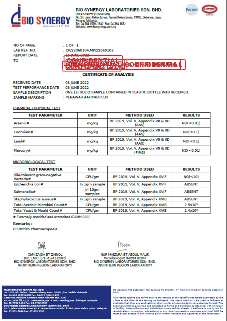 Penawar Aafiyah ADALAH 100% HERBA dan BEBAS DARI SEBARANG BAHAN-BAHAN BAHAYA. Berikut adalah salinan digital PENGESAHAN SURAT RACUN yg dilakukan keatas bahan-bahan Penawar Aafiyah.
